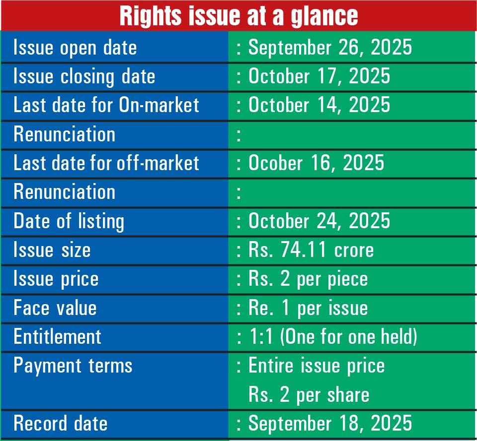 In the case of the rights issue, the company will issue 37.10 crore equity share of Rs. one each to existing shareholders (record date September 18, 2025) in the ratio of the for one at a price of Rs. 2 per share (premium Re. 1 per share). Thus the total size of the issue will be Rs. 74 crore. The new shares will be listed on the BSE on October 24, 2025.