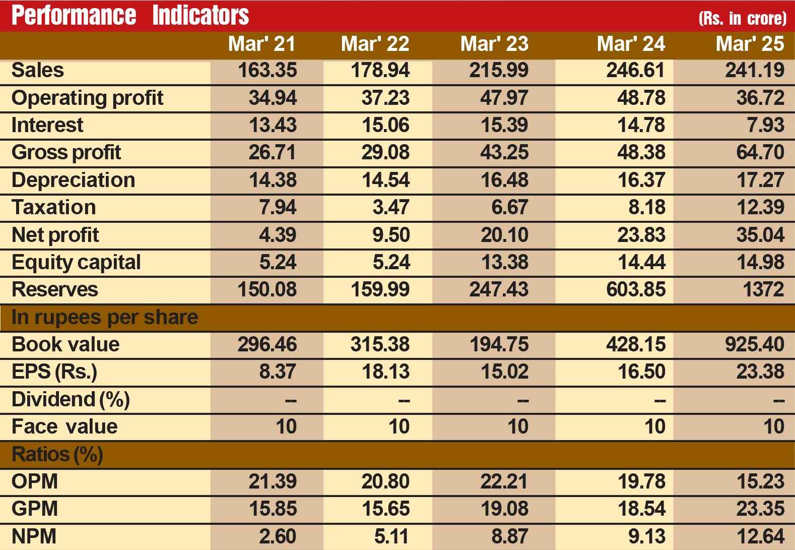 The company has been making rapid strides in its financial performance. During the last 13 years, its sales turnover has almost trebled from Rs 138 crore in fiscal 2013 to Rs 335 crore in fiscal 2025, with operating profit more than trebling from Rs 23 crore to Rs 75 crore and the profit at net level shooting up more than seven times from Rs 8 crore to Rs 61 crore. The 5-year compounded sales growth has registered a rise of 33 % and CAGR profit growth has crossed the 100% mark to reach at 105 %. Its financial position is extremely strong, with reserves at the end of March 2025 standing at over 91 times its tiny equity capital of Rs 150 crore. The company’s debt burden is negligible, with financial costs (interest) for fiscal 2025 being just Rs 9 crore.