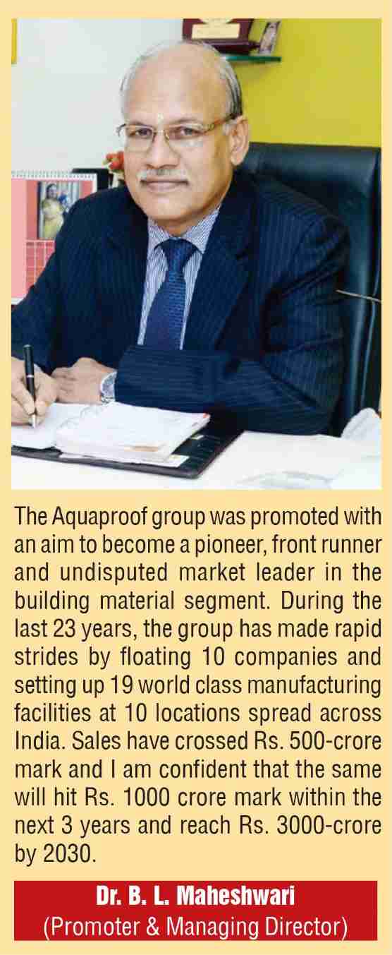A new star has risen in the construction material skies of India. The Goregaon (Mumbai)-headquartered Aquaproof group, promoted by far-sighted and dynamic first-generation entrepreneur Dr. Bajranglal Maheshwari, is an ISO-certified construction chemicals company which provides a complete range of wall care, tile care, dry mix mortar, water proofing and coating solutions for building and other civil constructions. Promoted in 2002, the group aimed at becoming a pioneer, front-runner and undisputed market leader in its segment. Aquaproof has made rapid strides during the last 23 years of its existence by floating 10 companies and setting up 19 world- class manufacturing facilities at 10 locations spread across India.