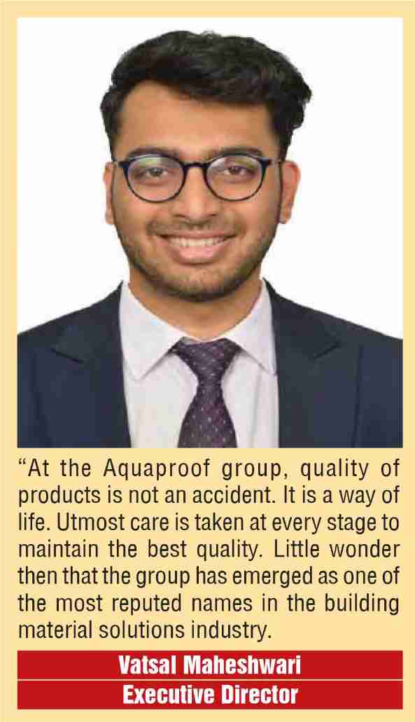 Maintaining that "Aquaproof is a growing conglomerate that has a history of enduring relationships with renowned global companies," Mr Maheshwari adds proudly, "Our group is ISO 9000:2015, 14000:2015 and 45001:2018-certified, and with our own manufacturing facilities. The group is present in western, eastern and northern India. I can say proudly that Aquaproof is today one of the major brands in the industry. It is committed to building a strong and prosperous nation."