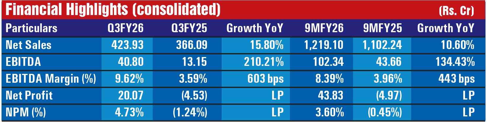 For the nine months ended December 2025, on a consolidated basis net sales reached Rs 1,219 crore (10% up), EBITDA Rs 102.34 crore (134% up), and EBITDA margin 8.39% (443 bps up), whereas net profit is Rs 43.83 crore vis-àvis a Rs 4.97 crore loss in FY25. The significant improvement in EBITDA margin is remarkable.